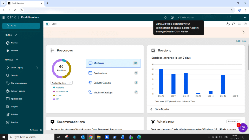 - Supported modules / environment context: Aidrien’s environment-aware features only work when your deployment uses supported Citrix DaaS or NetScaler Console service modules.