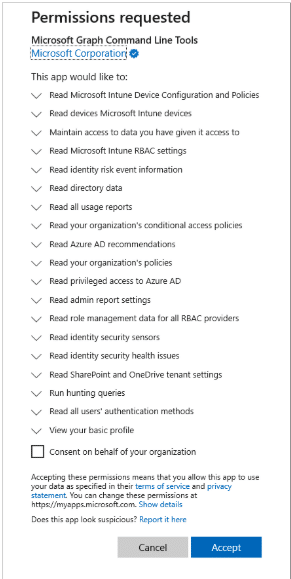 If this is your first time signing in, you will be prompted to approve several Microsoft graph permissions see below: